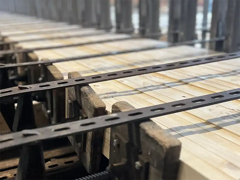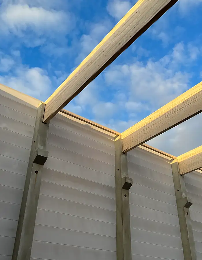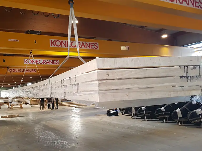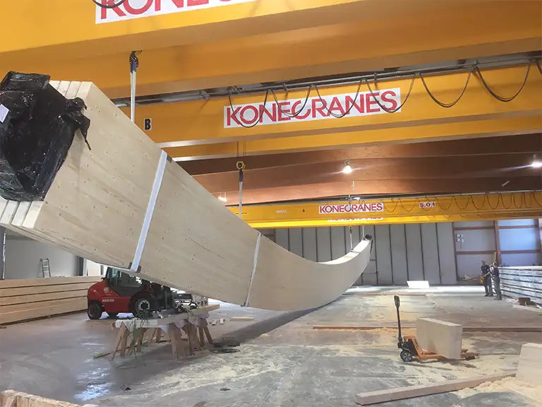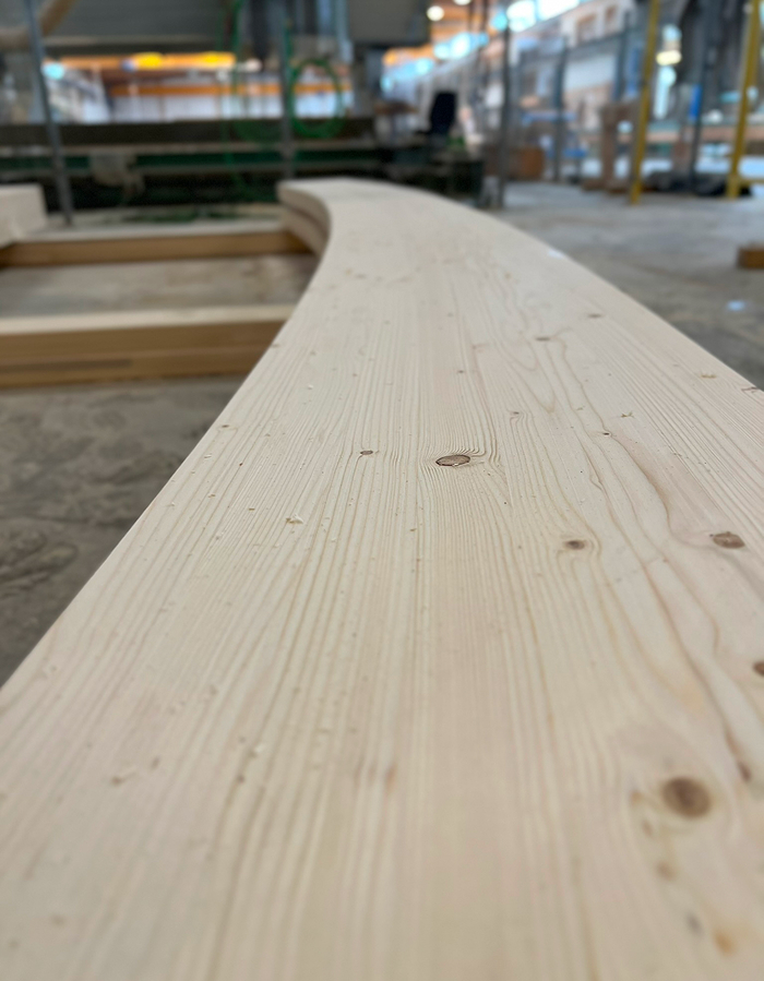 Unsere Stärke liegt in der Vielfalt: Wir fertigen Brettschichtholz-Träger (BSH) in unterschiedlichsten Formen – gerade, gebogen oder schräg angeschnitten – und realisieren Spannweiten von bis zu 50 Metern. So entstehen maßgeschneiderte Lösungen für Gewerbe-, Industrie-, Modul- und Sportbauten.